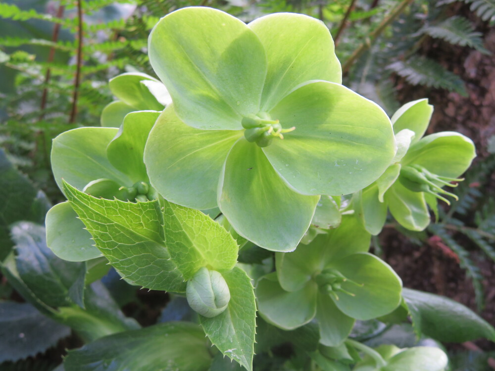 We’re now traveling from South America to Europe to encounter the Helleborus argutifolius, originating from the Mediterranean islands of Corsica and Sardinia. It’s the largest of its species, reaching a height of one meter, and it bears bowl-shaped light green flowers.