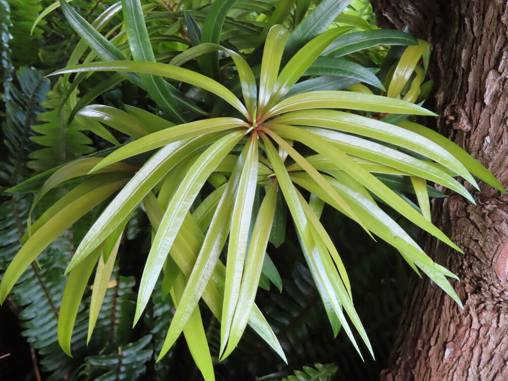 We will start our journey today with Aaron in front of the Podocarpus Neriifolius or Oleander Podocarp, a conifer related to New Zealand's Totara tree. This species is native to regions spanning from Southeast Asia to the Western Pacific, and its leaves bear a resemblance to those of the commonly cultivated oleander bush. The Oleander Podocarp is a tree that produces valuable construction lumber. Many parts of this tree, commonly gathered from the wild, are utilized as medicine and as a source of food because its fruits are edible.
