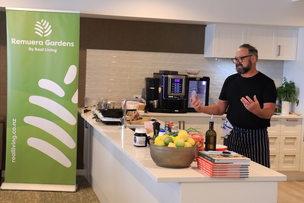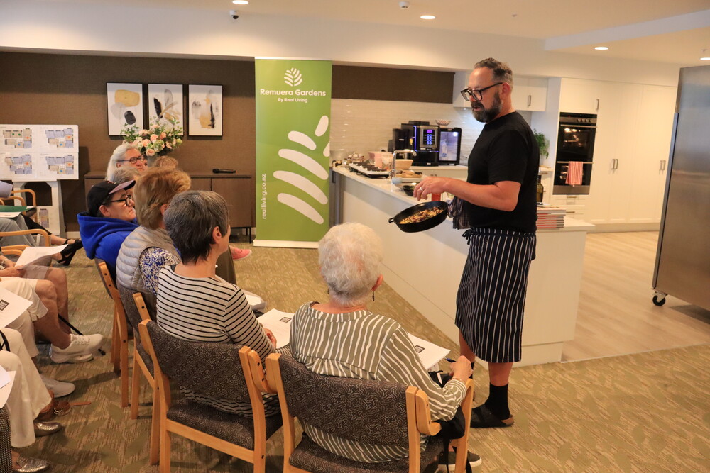 Michael’s passion for food began at just 14, washing dishes in a Henderson restaurant. Captivated by the buzz of the kitchen, he soon worked his way up, later travelling to London and Ireland before returning to New Zealand to open several successful restaurants. In recent years, he’s dedicated himself to sharing his love of wholesome, easy cooking through television, radio, and his own cookery school, Good from Scratch Cookery School in Muriwai. After the cooking demo, there was a Q&A session where residents had the chance to ask Michael questions about his career, cooking philosophy, and life in the kitchen. Resident Mel Chitham asked him about the roots of his culinary journey.